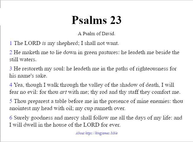 Psalms 23 - The King James Bible: https://kingjames.bible/Psalms-23