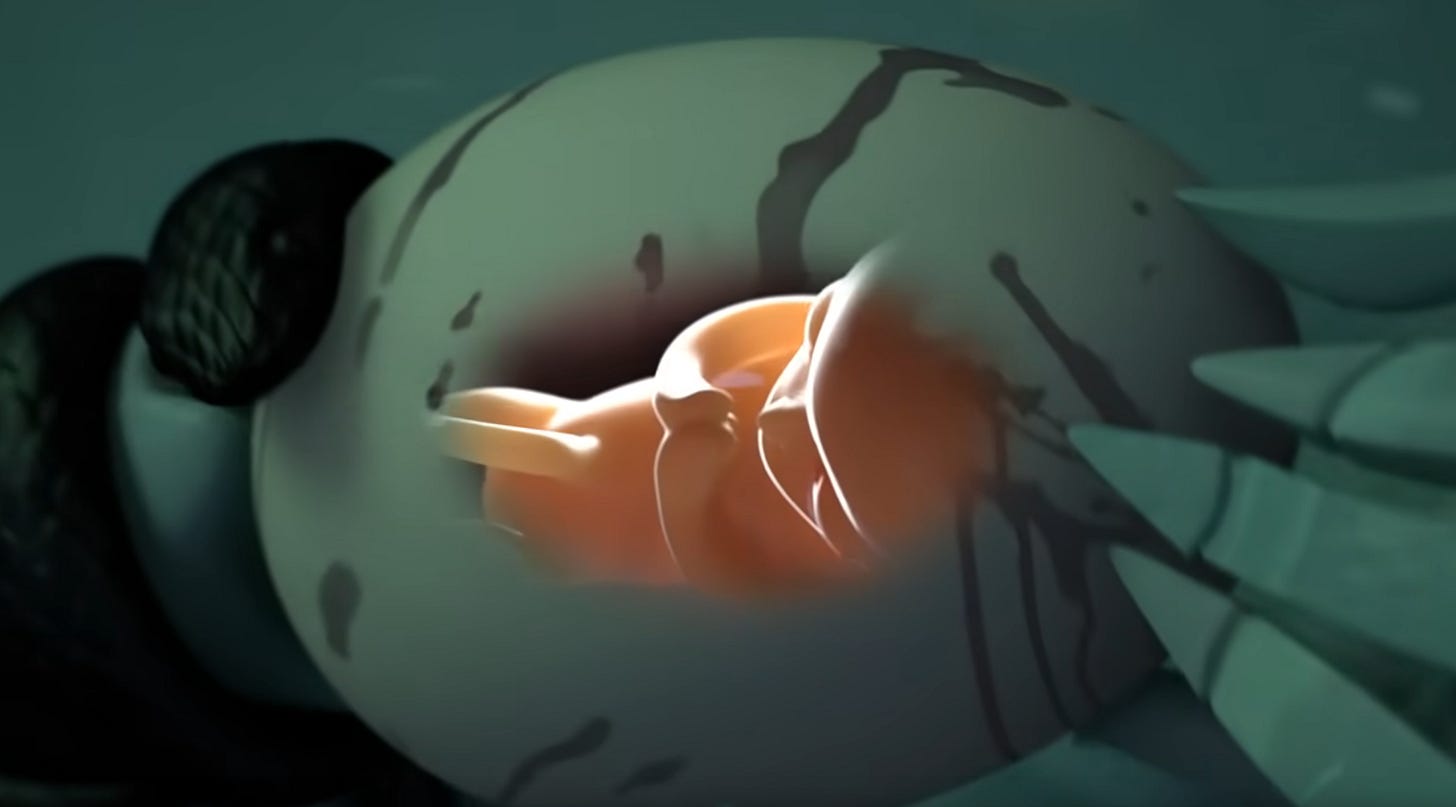 2:32 Egg fetus - A Human fetus is shown inside an egg, which a snake is coiling around.