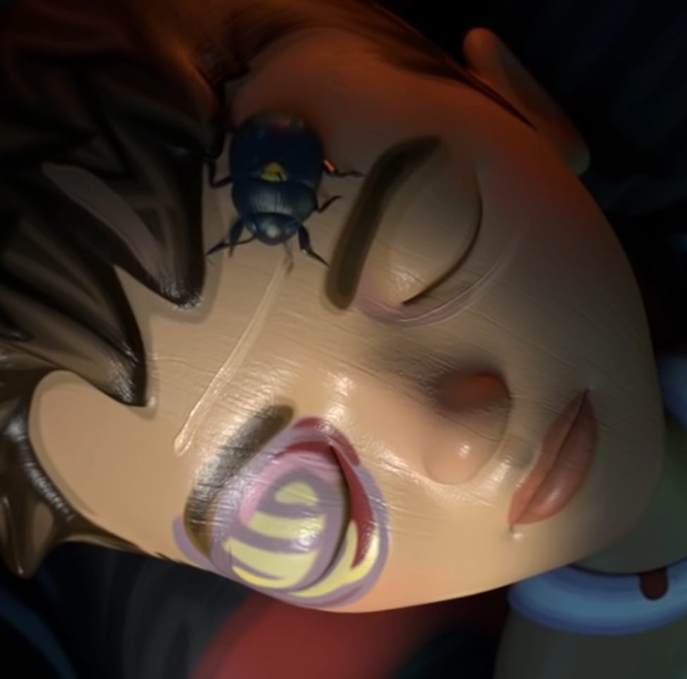 3:20 Dung beetle (scarab) - The child is shown close-up with a scarab (dung beetle) crawling over his face. The scarab symbolizes divine manifestation and the rising sun god24, which makes sense as this boy is a descendant of Jesus or representative of the Davidic bloodline. I believe this helps define this character as the truth about the death of Jesus, which we will see further clarified later on.