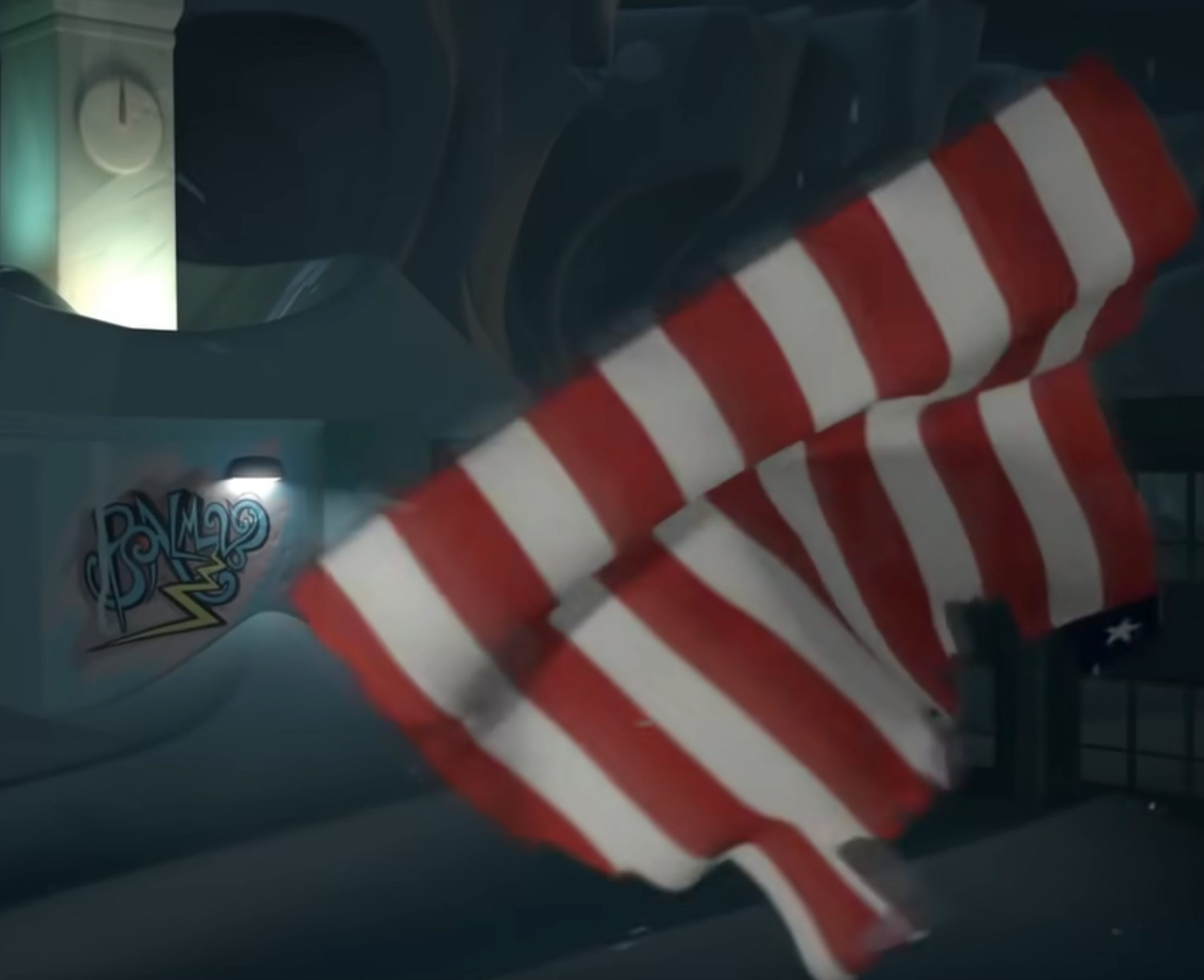 1:47 Torn Flag - An allusion to the United States being torn apart and being carried off into the distance by the wind. This indicates that the country is being destroyed.