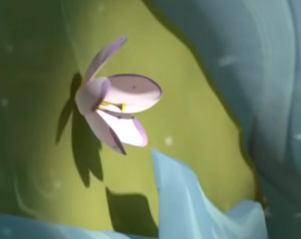 3:28 Lotus flower drops into goo - Immediately after the pink bow around the pregnant belly of Claddagh Girl is untied, the scene cuts and we see a lotus flower appear floating along a river of green goo. I believe this flower may be symbolic of the life that was taken from Claddagh Girl — or even more generally, life disappearing.