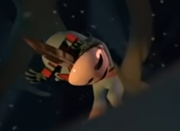Many who have analyzed this character assumed it was Native American because of the peripheral symbolism — the way the character danced or the objects around it. Nothing about this character is Native American except the Racoon tails, but there are several other features that are definitely not Native American. The fundamental outfit of this character is a skin-tight uniform with a modern, glowing emblem on the front — like a Star Trek uniform, or — wait for it — Space Force. In my opinion, it is no accident that Space Force is relevant to today given the overall message of this film.