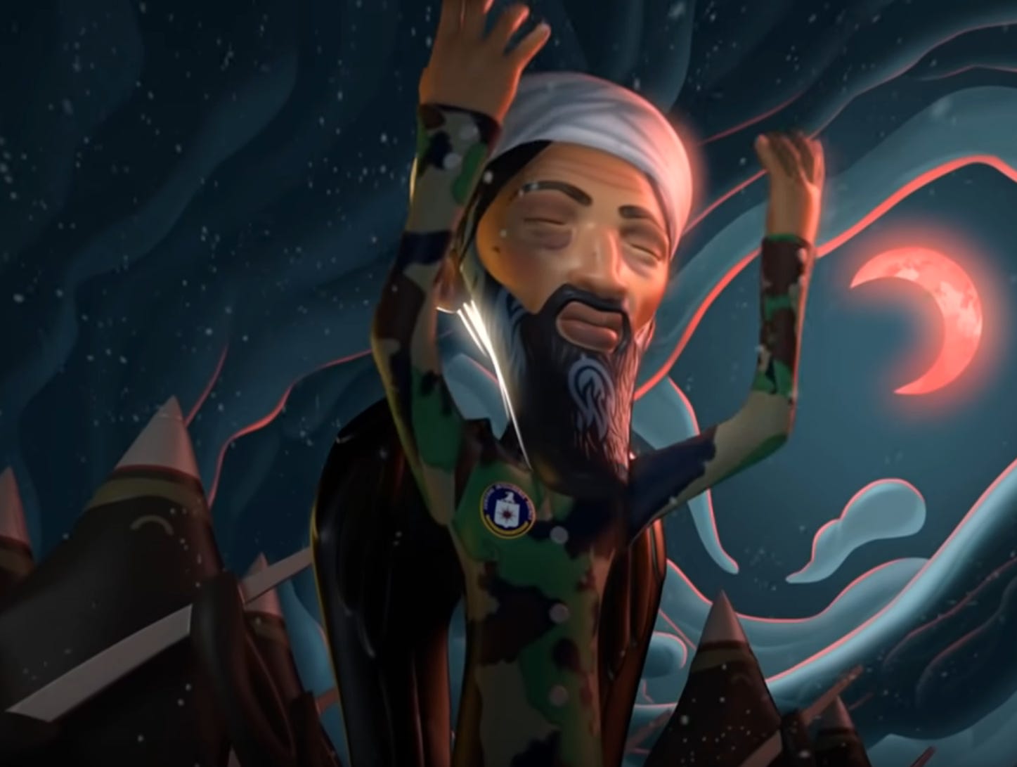 2:18 Osama Bin Laden - Shown clearly conjuring up evil, easily identifiable Osama Bin Laden wears a CIA patch on his chest. Osama Bin Laden’s real name may be Tim Osman.6 Also prominent but difficult to notice, Bin Laden has black wings. This shows Bin Laden is an angel (messenger) of evil and death. He is shown conjuring evil things, which fits perfectly into this motif.