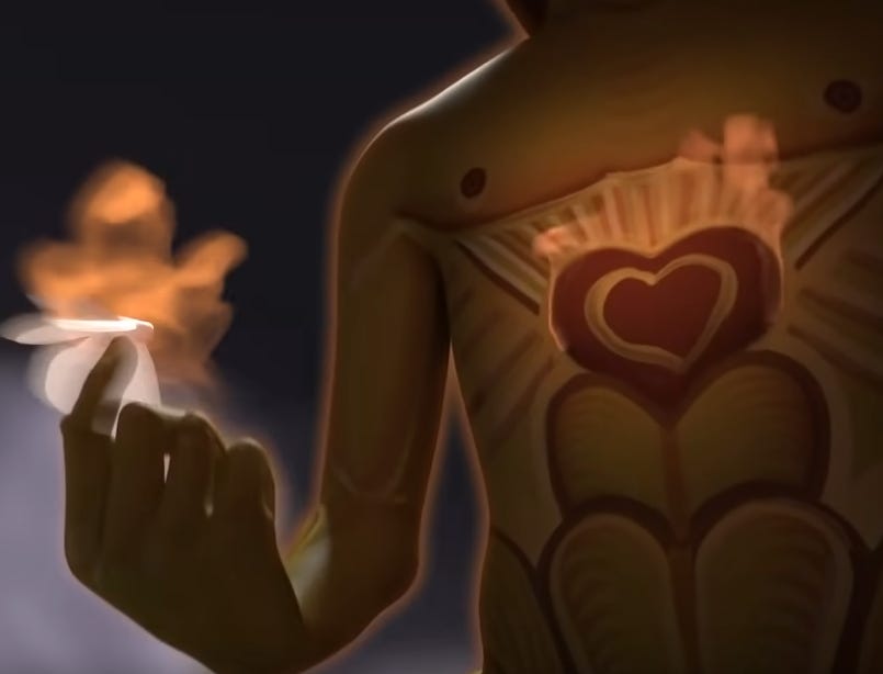 2:41 Human Spirit watching - For the first time, we are introduced to the Human Spirit - the combined ability of Humanity to reach self-enlightenment. The Heliofant site defines this character as the Fire of Truth. The flame seen burning here symbolizes truth. It is worth noting here that the amount of fire (truth) on and in this character increases over time until it is full of truth toward the end of the film.