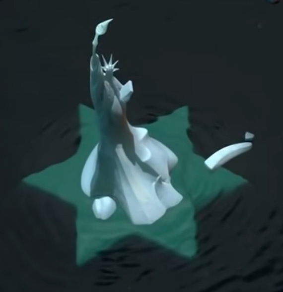 2:30 Lady Helotry arm falls - The arm holding the torch breaks off and falls, implying that Israel’s system of imposing slavery and serfdom is breaking.